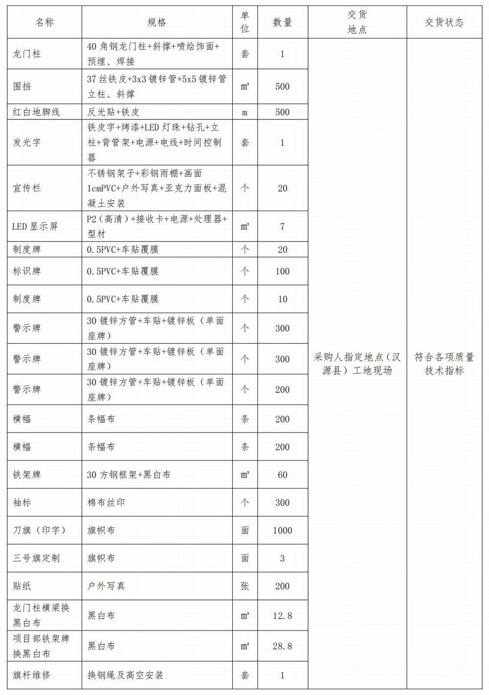 漢源縣白巖河水環(huán)境綜合治理項(xiàng)目一標(biāo)段、漢源縣堤防水毀災(zāi)后恢復(fù)工程、漢源縣馬烈鄉(xiāng)高山冷水魚(yú)養(yǎng)殖基地建設(shè)項(xiàng)目、漢源縣馬烈鄉(xiāng)山洪溝綜合治理工程、四川省漢源縣小堡藏族彝族鄉(xiāng)田杯子山洪溝綜合治理工程項(xiàng)目及四川省流沙河漢源防洪治理工程項(xiàng)目安全生產(chǎn)標(biāo)準(zhǔn)化廣告服務(wù)采購(gòu)清單: