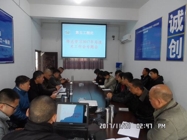 2017年11月21日下午,第五工程處在安岳縣關(guān)刀橋水庫灌區(qū)一標(biāo)段項(xiàng)目部會(huì)議室召開專題會(huì)議,傳達(dá)學(xué)習(xí)2017年局第十三次技術(shù)工作會(huì)議精神。會(huì)議由處長陳道剛主持。