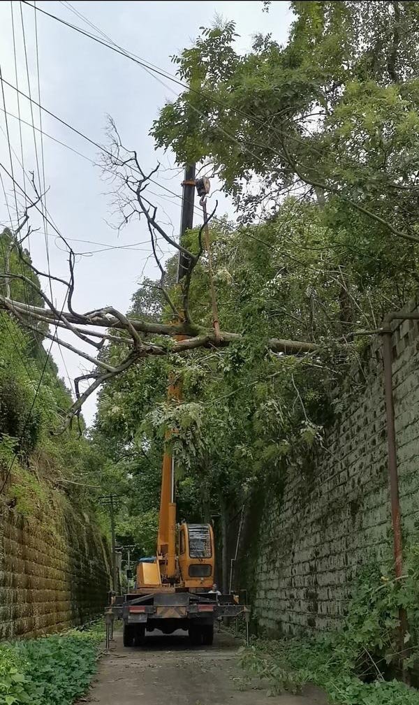 時值正午,烈日當(dāng)空;雨后的地面,熱氣蒸騰;草叢中蚊蟲成團(tuán)飛舞,在人的身上滿飲鮮血后,還不忘留下片片“小山包”印跡。在多名片區(qū)住戶大媽的期待眼神中,張尚明和部門人員在現(xiàn)場進(jìn)行指揮及安全指導(dǎo),參與人員忍受著腹中饑餓和蚊蟲叮咬,在機(jī)械設(shè)備協(xié)同助力下,將倒伏在電線上的枯樹平穩(wěn)吊下并分解。枯樹被吊下后,對糾纏在一起的輸電線路繼續(xù)進(jìn)行清理和檢查,確保送電萬無一。
