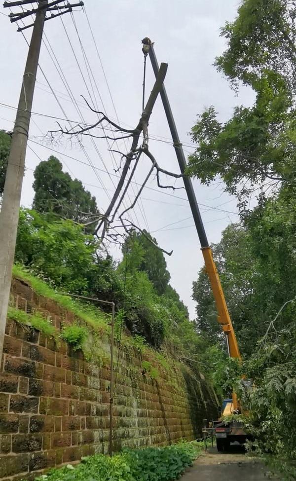 經(jīng)與房管處溝通并向公司領(lǐng)導(dǎo)匯報后,機(jī)電設(shè)備處立即準(zhǔn)備組織人員和設(shè)備。由于園林部門忙于處置城區(qū)多處斷裂倒伏的樹木,暫時無法抽出人員和設(shè)備。經(jīng)多方聯(lián)系,臨近中午時,處置人員和吊車抵達(dá)倉庫。張尚明立即會同作業(yè)人員現(xiàn)場查看,擬定好實施方案,并反復(fù)交代安全注意事項后,作業(yè)人員立即著手進(jìn)行處置。