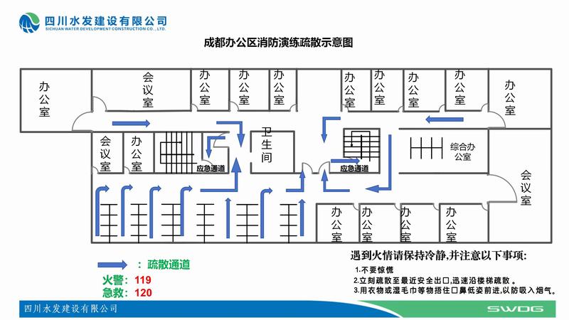 為貫徹落實習近平總書記關于防災、減災、救災重要論述,認真做好“預防為主、防消結合”方針和“人民至上、生命至上”安全發展理念的學習宣貫,樹牢“以練為戰、以戰為訓”意識,嚴格執行“三個避讓和三個緊急撤離”要求,將集團2024年第一次工作會議精神落地落實,把好“消防關”、建好“安全門”、守好“逃生路”,建設公司黨委高度重視、積極響應,成立應急演練領導小組,迅速制定《四川水發建設有限公司2024年火災疏散逃生應急演練方案》,于2024年3月1日開展建設公司火災疏散逃生應急演練。