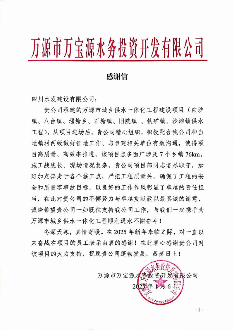 亭子口項目收到蒼溪縣亭子口灌區工程項目建設工作領導小組辦公室、四川省亭子口灌區建設開發有限公司發來的表揚信;資陽市雁江區第六中學重建工程項目收到資陽市雁江區第六中學發來的感謝信;平昌縣友誼水庫除險加固工程及友誼灌區2023—2025年續建配套與節水改造項目收到平昌縣友誼水庫運行保護中心的表揚信;萬源市城鄉一體化工程建設項目收到萬源市萬寶源水務投資開發有限公司發來的感謝信。