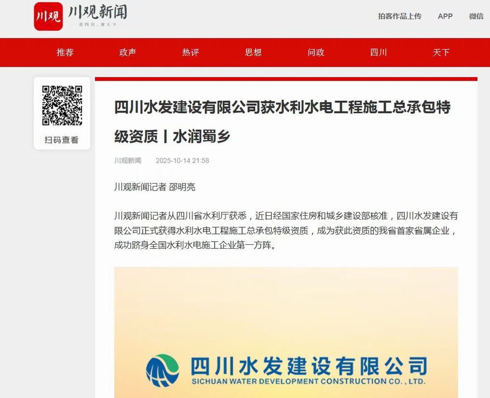 近日,四川水發建設有限公司正式獲得水利水電工程施工總承包特級資質,成為四川省首家獲此資質省屬企業,成功躋身全國水利水電施工企業第一方陣,受到四川日報、川觀新聞等省級媒體報道及行業內外廣泛關注。