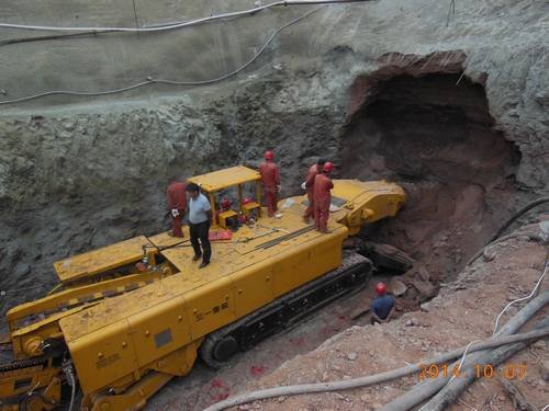 經(jīng)過1周時間的安裝,工程局第一臺懸臂式掘進機于 2014年10月7日在王家坪隧洞出口工作面掛口正式投入運行,武引二期西梓干渠第五標段隧洞工程由此進入施工高峰期。