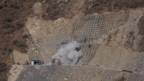 “清理現(xiàn)場(chǎng)物品”,“人員、車輛撤離”,“準(zhǔn)備就緒”,“點(diǎn)火”,隨著一聲巨響,一股棉花般的濃煙出現(xiàn)在山腰。6月22日下午6時(shí),新藏項(xiàng)目部8#施工支洞成功實(shí)施掛口爆破。