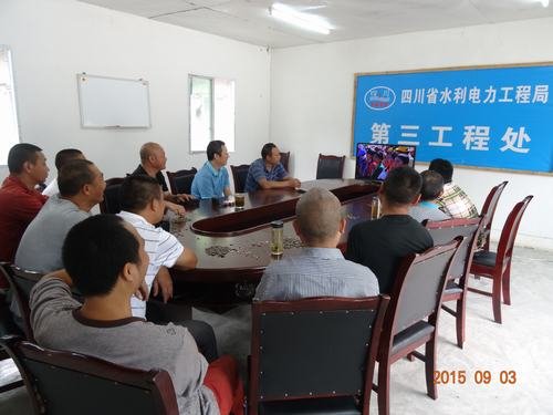 2015年9月3日上午,三處處長李軍帶領三處領導班子、處各科室主要負責人,在后溝水庫項目部會議室組織職工觀看紀念中國人民抗日戰(zhàn)爭暨世界反法西斯戰(zhàn)爭勝利70周年紀念大會電視直播。