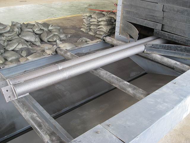 后工件表面表面的光潔度和粗糙度符合有關(guān)的標(biāo)準(zhǔn)規(guī)定。小口徑的鋼管使用內(nèi)壁噴丸機(jī),鋼管內(nèi)壁噴丸處理線,主要包括移動(dòng)臺車,砂斗,噴砂罐,噴槍,噴槍承載車,鋼管承載系統(tǒng),底部彈丸